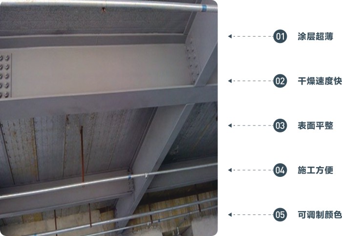 膨胀型钢结构防火涂料适用于体育馆、展览馆、发电厂、石油化工、机场、车站候车室及工业厂房裸露承重钢结构的梁、柱和钢制管道等室内和室外的防火保护、保温和装饰作用。