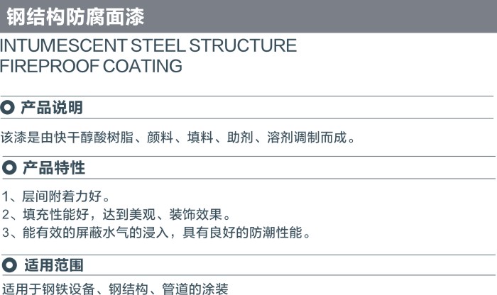 1.能在苛刻条件下使用,并具有长效防腐寿命 2.厚膜化是重防腐,涂料的重要标志 3.附着力强,涂层与基体结合力强 4.高效方便,施工简便 5.使用方法灵活
